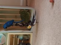 Whistles and talks “what’s up” has feather plucking under wings. Has leg band, will land on head. But not on fingers. Loves bell’s, mirrors, millet