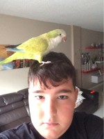 cinnamon green quaker parrot. blue tail. small bird not that big. she answers to “donde esta charlie?” and says “aqui!”.