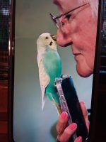 Azul has a blue body with white wings. Little black spots on side of face. He doesn’t let us touch him, but he hangs on us all the time.