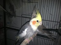 Dovie is not fond of people but will let you allow him/her to step up when its bedtime. Dovie has a different colored nails. Left front is white nail and she has black nails as well. Her toes are a bit longer than normal. When she sings it sounds like she is singing Papa is a pretty bird (she picked it up from her cage mate) When you do a wolf whistle she will copy you. Other than that she is a typical cockatiel with the rosy cheeks.