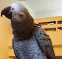 She speaks two languages (Polish and English). I don’t know if she would be comfortable enough to speak to others, though. She is about 350-380 grams on average, and she loves to call out our dog Max, and she speaks different variations of his name in both languages. She has a spot on her tail underside with grey feather where the bright red tail is but if she lost some feathers from flying out, not sure if it would be there.