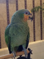 bright green with yellow and blue on face, orange red blue and black on wingtips and tail.