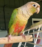 COOPER Is a CINNAMON GREEN CHEEKED PARROT, Cooper is 11 months old. He’s very sweet, non-aggressive. And Quiet for a Conure. While washing his cage, it tipped over and he was startled and FLEW out.
