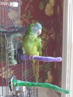 Green with blue feathers around head. Stressed from recent move to new home and pulled out tail feathers. Will give $100 reward if found and returned. She talks and does say her name as well as laughs.