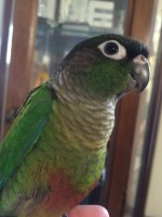 He flew out our door in Feb 6 2016 His name is Kiwi he does have a Purple leg band . he is scared of people he don’t know .