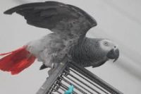 African Grey with bright red tail, name : Kiwi