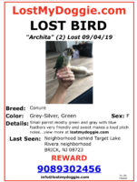 Sweet little bird very friendly may fly on your head or shoulder only about 10 inches in length… I’m very worried about my little baby I am praying she is ok and I will find her!!!!! if you find her please contact me as soon as possible❤️ Thank you!!!
