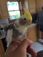 Her parents were a mix but she looks mainly pied. I raised her and hand fed her as a baby so she is incredibly sweet. She loves flying onto heads and shoulders, and will land on company/strangers. She specifically likes males.