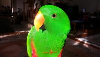 Eclectus male, named Pepper. 6 years old. Bright green bird with orange candy-corn colored beak. Red feathers under arms. Has very unique small amount of red feathers on center of breast. Leg band VATxxx (owner will supply complete band information). Talks very well.