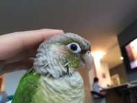 A green cheek conure with a more pale, lighter color ….Squacks really loud. Bops head up and down when happy. Kisses humans on the lips. Has a purple leg band…