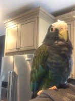 He can talk he says hello Felix. He likes to do the cat call and the whipping willow call. He likes to meow like a cat and can say Coco who is our dog.