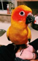 Jeff Jeff is a sun conure, medium size parrot. Her body is bright yellow. She has red around her eyes. Her wings are green and yellow. She is a female bird, not male. If you call her name “Jeff Jeff”, she responds with a loud screech sound. She is the most loveable/affectionate bird! She was last seen on the corner of Farrington and Central Avenue, West Caldwell, New Jersey.
