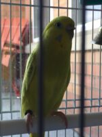 Small, bright yellow female parakeet. She doesn’t let people approach or grab her, she’ll likely fly away.