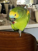 He screams a lot & is timid towards strangers. He hates being on any flat surface & will instantly either get on someone’s hand or fly away if he’s uncomfortable