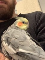 Quite loud. Small, grey with yellow head feathers. Loves to say “baby boy and I love you”. Has a red band around ankle. Only a year old.