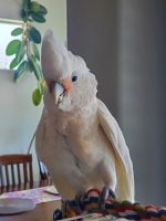 25 year old Goffin Cockatoo. All white with a bit of salmon color on face. If you see him he may respond to