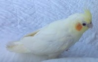 Stanley is a white cockatiel with a yellow crest and oranges cheeks. He responds to the name Stanley.