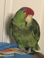 Mitu is a 10 year old Amazon Red Crowned Parrot. He is very food motivated, speaks Urdu, will reply vocally to his name being called, fully flighted (non-clipped wings), leg banded on right leg, will fly over if you wave your arms in the air, and gets tired quickly from flying.