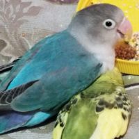 Tame and will come to you if you put your arm out. Sea green with a dark gray head, blue chest and belly with a purple tail