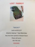 Red shouldered Hans Macaw “Mickey”. Talks. Feather loss on shoulders and from the waist down. Last seen in Newport Beach area of East Moriches, possibly heading East. Family heartbroken.