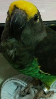 Pauly is approximately 5 years old and is a male Meyers bird. He has a silver band on his left leg.Owner will supply complete band information. He is pretty vocal and cautious around strangers. He is mostly grey but has a yellow patch on his head and around his eyes. His eyes are red. His belly is a blue green color with blue feathers under his wings and green feathers near his tail. His wings had been clipped a little recently. He has a little less yellow on his wings that most Meyers birds.