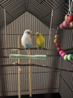 These are TWO parakeets that have been lost. They flew out of the balcony. One is white and blue; the other is yellow and green.
