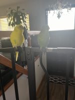 Very young, recently learned how to fly, not hand trained and easily frightened, she is bright yellow