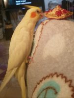 She has a slight bald spot under her mohawk. Has gray/brown eyes.