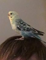 Normally very tame. She talks and imitates sounds of outdoor birds. She laughs, makes kissy sounds. She has a yellow head and a blue-green body.