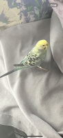 My bird is yellow and blue, she has a brown nose fully grown out wings and like throwing bottle caps on the floor as well as hair ties. she is almost about a year old and she makes lots of clicking noises.