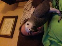 She is only 4 months old. She dos have her feathers clipped but apparently can fly…she is grey with a red tail