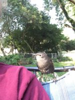Juvenile starling. Flighted but not yet too skilled especially due to destroyed tail feathers, escaped in the backyard two hours before nightfall. Does not yet have a name, although may answer to Buddy, Brazen or Chatty. Likes to land on heads when hungry.