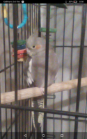 Rather skittish. Says Eric! Chirps loudly. Normal grey with white flight feathers. Missing half toe on right foot. Black & yellow stripes in tail. Orange cheek patches. Yellow & Grey crest. Very missed and loved