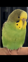 On His right foot he got an injury that has healed it has a knuckle that looks different then his other foot which without his tag on him will be the main indicator in confirming if clover is found by another. Green and yellow feathers with a blue tail feather- beige cere developing -does unique whistles and prr like noises-always responds back to a Budgie call and will land on your phone or hand even top of a hat if placed towards him.
