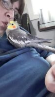 He is flighty. He can say Pretty Bird, Big Bird, he mimics a cough (I have asthma). He can whistle several things. He loves sitting on shoulders. He does not venture out too often away from shoulder or cage. He is very set in his ways. He goes to bed at 8PM and complains until the lights go off. He is a very focal male.
