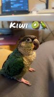 Kiwi is a yellow sided turquoise green cheek conure and he’s very bonded to me but is shy with anyone new… He’s not particularly loud so it has been hard finding him. He knows his name and I usually say “Kiwi Kiwi”. He’s only 3 years old…