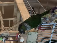 Green with white collar, she has bright red in her wings, loves apples and pears, popcicles. She will land on your shoulder or head to eat your food.
