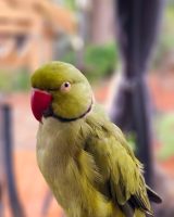 Hand raised, very friendly. Will probably come down to people for help. He over preens a couple tail feathers so they may appear raggedy. Just recently molted and sprouted a few new flight feathers we hadn’t noticed, thus how he flew away.