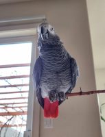 Responds to his name, can talk, beeps and clicks. Knows how to step up. Easily spooked by dogs and loud noises, scared of water and rain. He has a bald spot on the back of his neck from birth.
