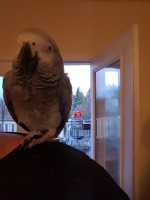 Lisa is a rescue. She had plucked herself almost clean and her wings were drastically clipped. In almost 2 years, she had never flown. She says “Freckles” “Ninja Bird” and whistles the theme to The Good, The Bad, and the Ugly along with Beethoven’s 5th intro. She is not friendly to women and can be aggressive. With men, she picks and chooses.