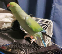 She is Green with Blue/Green Tailfeathers and backside. She has a Red Upper Beak and Black Lower with Golden Rings arround her eyes