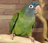 He is a Blue Crown Conure (small parrot), mostly green with a blue head and red under the tail feathers. He also has just a tiny spot of yellow on on of his shoulders.