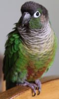 5 months old….Green Cheek Conure…..answers to Gabby……got out on December 17, 2017 in the Multnomah Village area of Portland, Oregon…….loves spray millet, broccoli and seeds – owner will supply band number