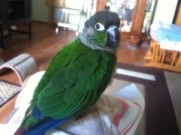 link showing a green cheek conure on someone’s shoulder. I lost my green cheek conure