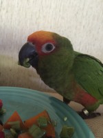 more trees going lower each time and he flew to my husband and we ran him to the cage. He has been eating fruit and