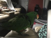 Red under the wings. His favorite word is wow and he makes a chirp like he’s agreeing with you when he’s relaxed. He can be lured with almonds, and he loves peas. He can bite if frightened but he’s generally a friendly bird. He’s flighted but missing feathers and will occasionally whistle.