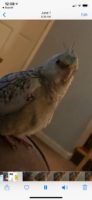 Grey and white cockatiel blue dot on top of head. Might be a little faint.