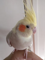 She is very sweet tempered, and gentle; she has small toes, lemony yellow feather tips, she would be considered almost a Cinammon Cockatiel, very light grey with bright orange cheeks.