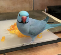 Very sweet blue male Ringneck Parakeet. Very tame, loves to ride on your head or shoulder. Gives kisses if asked. Talks, Gimme Kiss, Thank You, Peek a boo, and other phrases. He’s not afraid of dogs or other birds. Absolutely loves apples and will come down for one.