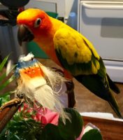 He is 1 year and 2 months old, about 11 inches from head to tail, bright yellow and orange around the face and chest, with green and blue wing feathers and tails.